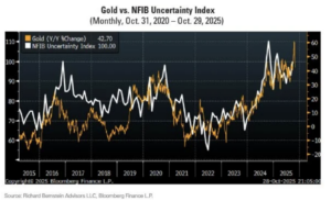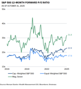Mag 7 has produced very strong earnings growth this year. Next year it is expected to slowdown but still be favorable. The other 493 S&P 500 stocks saw weak earnings growth this year as the economy slowed. However, the 493’s earnings are expected to pick up in 2026.