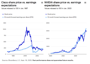 Case in point– both Cisco in the 1990s and Nvidia today played central roles in the infrastructure of their eras. Both saw strong price returns. But there is a significant difference—valuation. Cisco’s stock price was inflated by earnings assumptions that were wildly over-optimistic. Nvidia’s price has been driven by earnings. Cisco is a classic example of a price bubble while Nvidia’s stock price is backed by fundamentals.