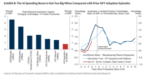 AI capex is in the early stages of a supercycle. Goldman Sachs (and other banks) estimates global AI-related infrastructure spending could reach $3 trillion to $4 trillion by 2030. A concern is that there is an overinvestment in AI. However, during previous technological revolutions, large amounts of capital have been needed for transformational change. Historical examples of technological breakthroughs requiring massive capital outlays are railroads, electrification, internal combustion engines and IT. These episodes have also seen over-investment as well. But today we are at the beginning stages of the AI revolution and much more investment is required. As a result, there does not appear to be an AI capex bubble.